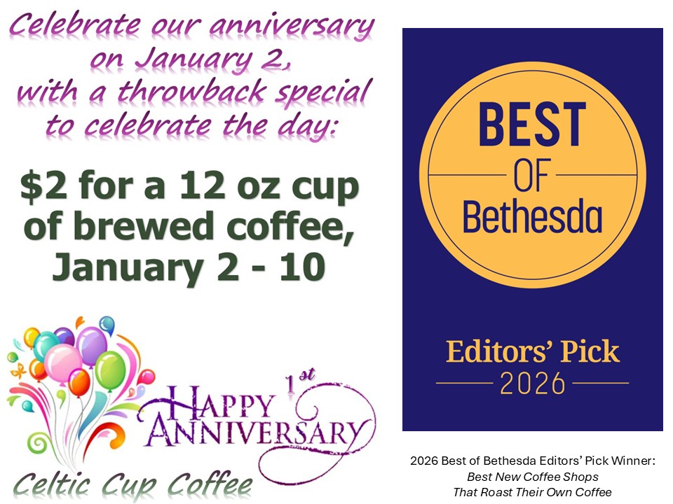 ANNOUNCEMENTS: Happy Anniversary to Celtic Cup Coffee + Come celebrate Best in Bethesda Editor’s Pick for 2026!