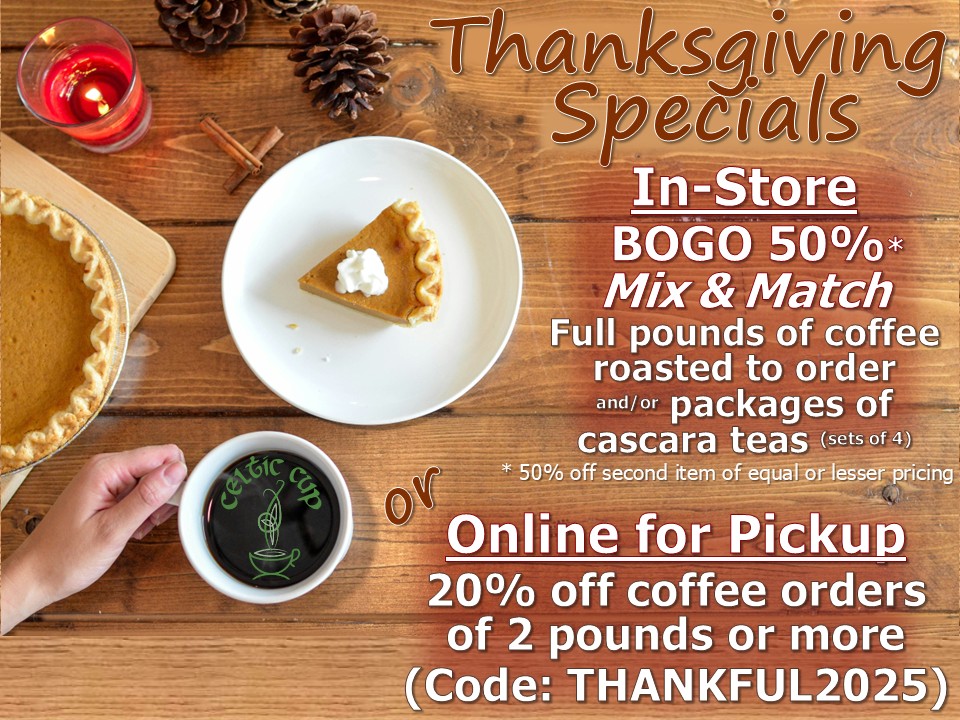 The “warming” spices we associate with the holidays fill our kitchens and our hearts with comforting aromas. Admittedly, we suspect that we’ll never offer any Pumpkin-Spice coffee selections. But, daily from 10am-2pm, starting November 1 through Thanksgiving, we ARE offering FREE samples of our Cascara teas!